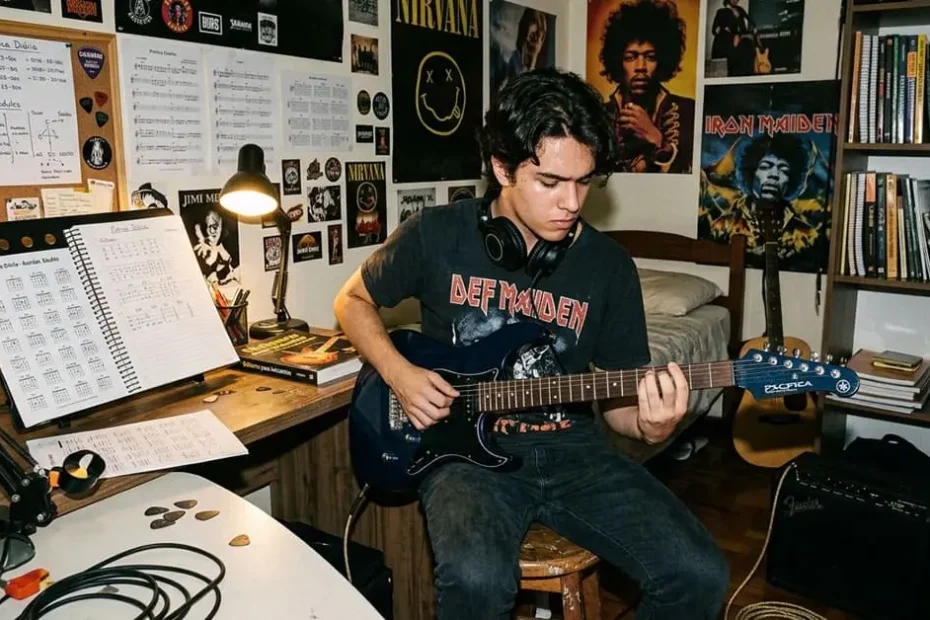 Um estudante iniciante praticando os primeiros acordes na guitarra durante sua rotina de estudo. Quando alguém decide aprender guitarra, uma… Continue a ler »Primeiros acordes na guitarra: o …