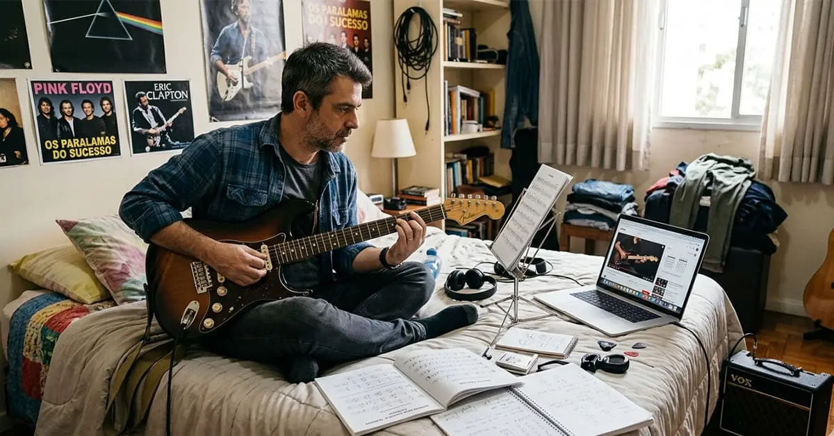Um estudante iniciante praticando os primeiros acordes na guitarra durante sua rotina de estudo.