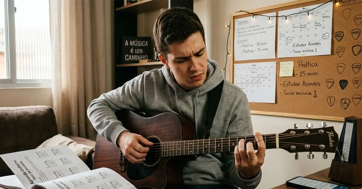 Um estudante iniciante praticando acordes enquanto aprende guitarra e organiza sua rotina de estudo.